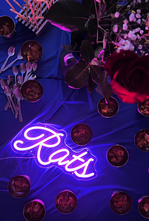 with LAB DER MUSIKAn immersive multisensorial dining performance where food, live music, and cinema merged into a single, carefully staged experience. ‘Blue Velvet – A Synesthetic Supper’ drew its aesthetic directly from David Lynch’s visual language: red roses against a white picket fence, the electric glow of neon signs, and the deep, tactile allure of blue and crimson velvet. Hosted at Lab der Musik, a cozy music school in Neukölln, the evening unfolded following the structure of operatic acts, each separated by live performances from professional musicians. The menu acted as a series of edible vignettes, each designed to echo the contrasts and textures of Lynch’s world. Tables dressed in midnight-blue cloths reflected the glow of candlelight and neon, while carefully composed plates blurred the boundary between visual set-piece and culinary delight. By the final act, the supper had become a living scene: a charged, dreamlike frame where taste, sound, and vision existed as one.