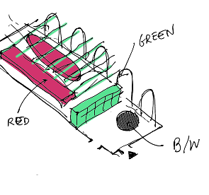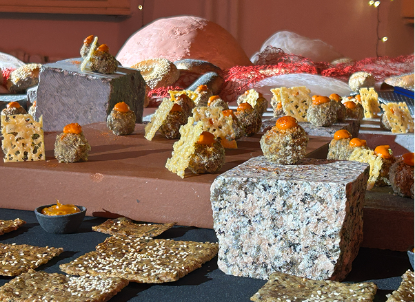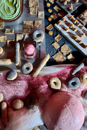 Edible Landscape emerges from the encounter between landscape architecture and food, translating TOPOTEK 1’s design language into an edible terrain. Starting from the chromatic map of the Superkilen project—red, green, black and white—the installation unfolds as a sequence of “rooms” arranged on a black circular table, reflecting Topotek’s recurring use of spatial compartmentalization as a landscape strategy. Each room interprets a fragment of the landscape through edible forms, colors, and materials: A pink dome of beetroot–anchovy butter, accompanied by uniquely shaped bagels, recalls Topotek’s inflatable structures; stone, marble, brick, and cobblestone samples become surfaces for small bites; an intentionally artificial green takes shape in bright pea hummus and chimichurri. Food acts as ground, architecture, and color field, transforming the table into a sensory landscape to be navigated, tasted, and shared.