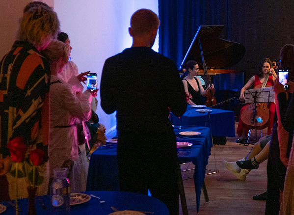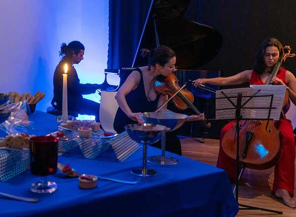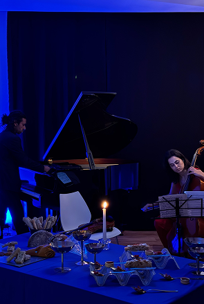 with LAB DER MUSIKAn immersive multisensorial dining performance where food, live music, and cinema merged into a single, carefully staged experience. ‘Blue Velvet – A Synesthetic Supper’ drew its aesthetic directly from David Lynch’s visual language: red roses against a white picket fence, the electric glow of neon signs, and the deep, tactile allure of blue and crimson velvet. Hosted at Lab der Musik, a cozy music school in Neukölln, the evening unfolded following the structure of operatic acts, each separated by live performances from professional musicians. The menu acted as a series of edible vignettes, each designed to echo the contrasts and textures of Lynch’s world. Tables dressed in midnight-blue cloths reflected the glow of candlelight and neon, while carefully composed plates blurred the boundary between visual set-piece and culinary delight. By the final act, the supper had become a living scene: a charged, dreamlike frame where taste, sound, and vision existed as one.