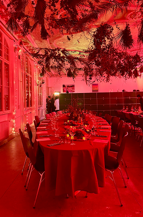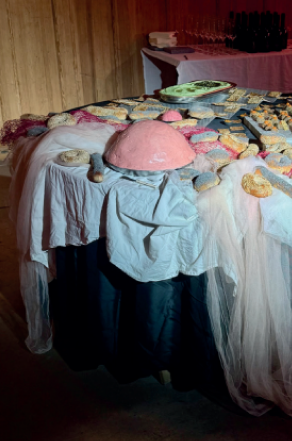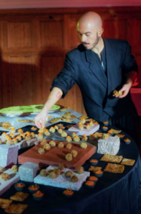 Edible Landscape emerges from the encounter between landscape architecture and food, translating TOPOTEK 1’s design language into an edible terrain. Starting from the chromatic map of the Superkilen project—red, green, black and white—the installation unfolds as a sequence of “rooms” arranged on a black circular table, reflecting Topotek’s recurring use of spatial compartmentalization as a landscape strategy. Each room interprets a fragment of the landscape through edible forms, colors, and materials: A pink dome of beetroot–anchovy butter, accompanied by uniquely shaped bagels, recalls Topotek’s inflatable structures; stone, marble, brick, and cobblestone samples become surfaces for small bites; an intentionally artificial green takes shape in bright pea hummus and chimichurri. Food acts as ground, architecture, and color field, transforming the table into a sensory landscape to be navigated, tasted, and shared.