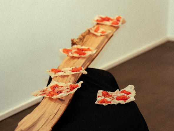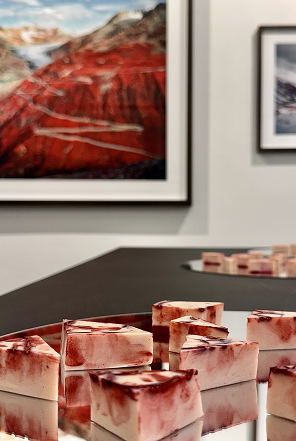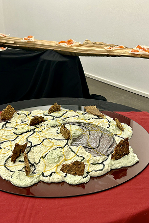 At Luisa Catucci Gallery in Berlin Mitte, we presented a food installation exploring a continuous chain of translation: just as nature informed the artists' vision, their work became the foundation for our culinary exploration. Responding to the NATURE’S SIGNATURES exhibition, we metabolized static artworks into a synesthetic, edible medium, focusing on color, texture, sound, and organic composition. Zak van Biljon’s infrared landscapes — where the green of chlorophyll turns into striking crimson — were mirrored through the use of natural red pigments like beetroot, subverting visual expectations. Tom Kretschmer’s focus on rhythm was turned into an experience of sound and touch. The sharp crunch of fragile crackers against viscous, slow-moving sauces brought the wild rhythms of nature directly to the palate. Finally, Samanta Malavasi’s root patterns became our floor plan, letting organic growth dictate how the food inhabited the tablescape. If art imitates life, and life imitates art, here food imitates both, turning the act of eating into a radical exploration of perception.
